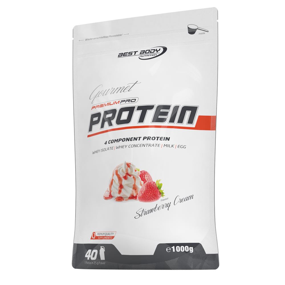 Best Body Nutrition Gourmet Premium Pro Protein, Concentrado de proteína para la preparación de una bebida fría aromatizada. Con edulcorantes. Con sabor a fresa.