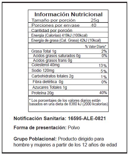 65,3% de proteína de leche , 15% de concentrado de proteína de suero , 10% de aislado de proteína de suero , 3,2% de fruta de fresa en polvo (55,4% de fresas, 23,1% de maltodextrina, 21,5% de maicena) , aroma, 1% de proteína de huevo en polvo, colorante (betanina), edulcorante (ciclamatos, acesulfamo K, sacarinas), emulsionante ( lecitinas de soja ), espesante (carragenina), ácido (ácido cítrico), antiaglomerante (dióxido de silicio, calcio, fosfatos), puede contener trazas de gluten.